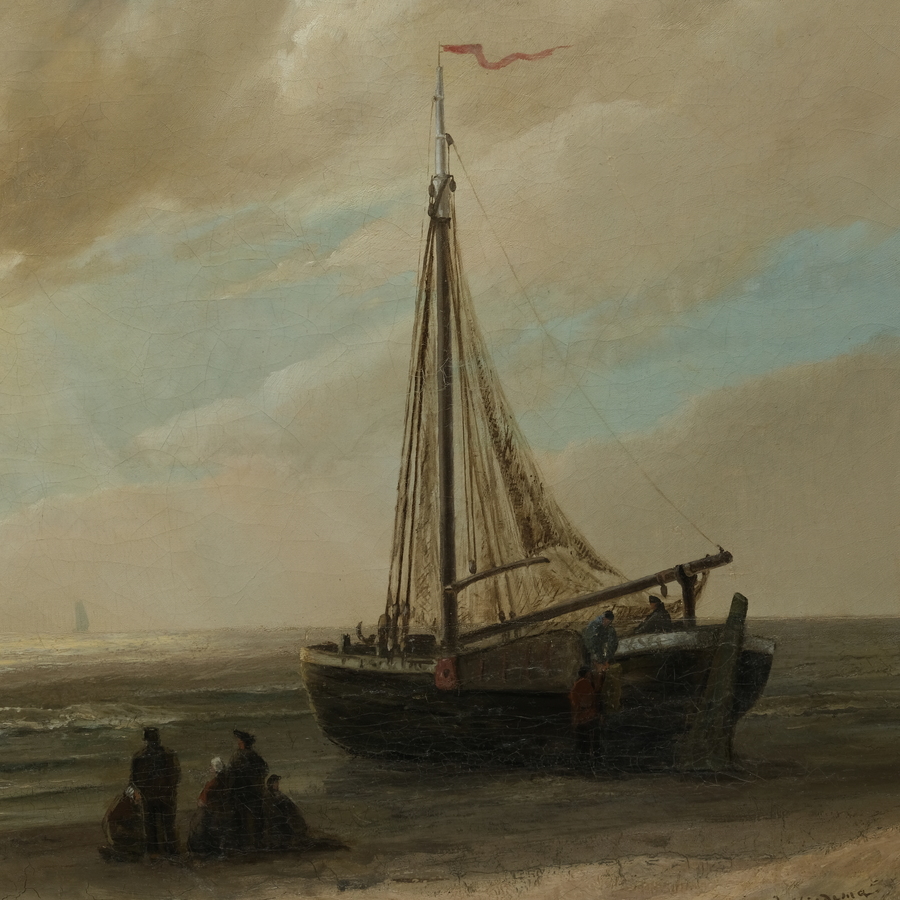 Schilderij, olieverf op doek. Bomschuit en vissers op het strand. Rechtsonder gesigneerd Rein Miedema (Harlingen 1835 - Rotterdam 1912), gedateerd 1884