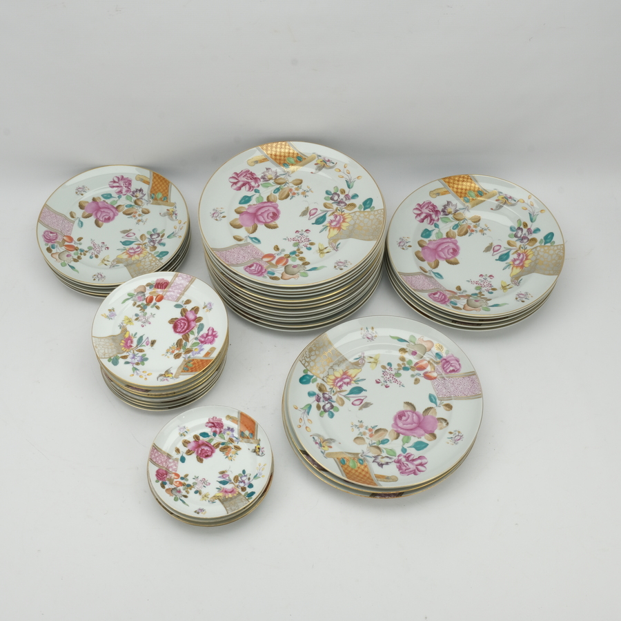 Lot diverse serviesdelen: veertien dinerborden (25,5 cm), gemerkt Mottahedeh Vista Allegre, twee dinerborden (26 cm) gemerkt "hand painted in China for Wordly Things", vijf soepborden (25 cm) ge...