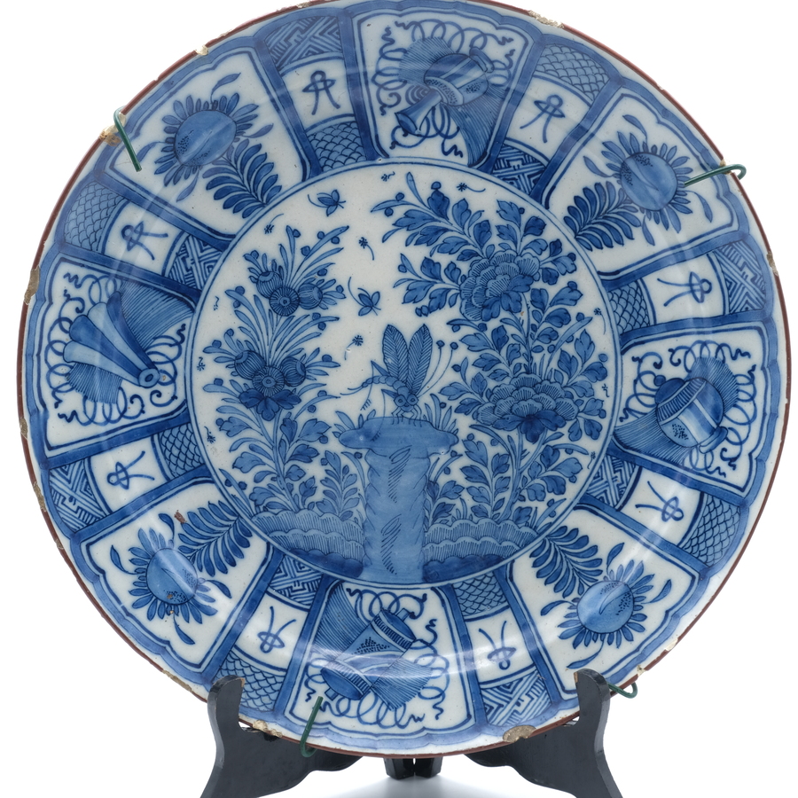 Een 18e eeuwse aardewerken schotel. Blauw/wit chinoiserie naar een kraak voorbeeld. Florale decors in vakverdelingen en een libelle op rots tussen de bloemen op het plat. Gemerkt voor Jan Teunis...