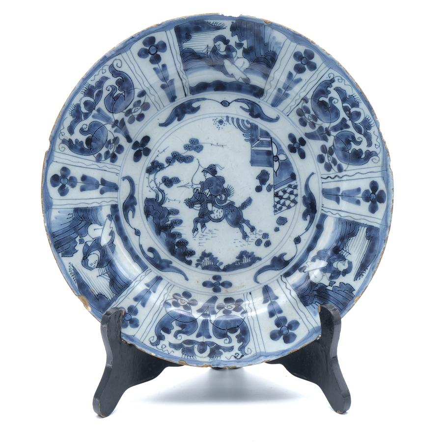 Een laat 17e eeuwse Delfts aardewerken schotel. Blauw/wit Chinoiserie decor naar een kraak voorbeeld. Voorzien van vakverdelingen met rustende chinezen en bloemen en op het plat een krijger te ...