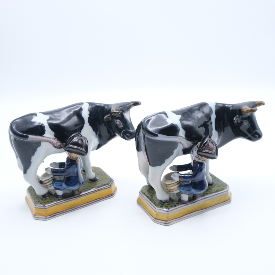 Twee aardewerken sculpturen van koeien met melkers. Polychroom en handbeschilderd. Gemerkt Tichelaar, Makkum.