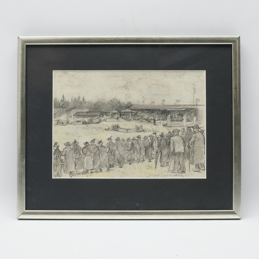 Krijttekening, voorstelling van het Concours Hippique te Brussel. Rechtsonder gesigneerd Frans van Leemputten (Werchter 1850 - Antwerpen 1914)