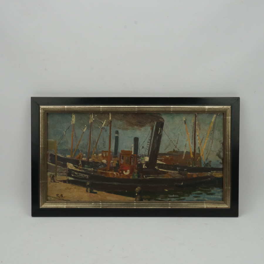 Schilderij, olieverf op doek. Haven met 3 sleepboten, 'Schiff auf Amstel'. Linksonder gemonogrammeerd 'Tjb' = Tjerk Bottema (Boppeknipe 1882 - op zee bij Bordeaux, 1940)