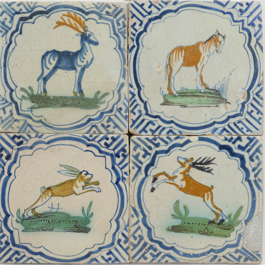 Vier antieke 17e eeuwse tegels, polychrome dieren (o.a. hert, paard en konijn) in blauw-wit Wanli medaillon