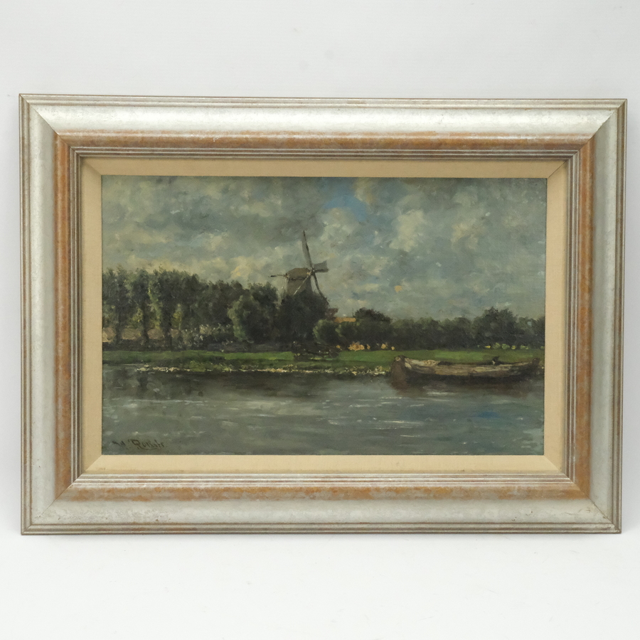 Schilderij, marouflé (doek op paneel). Polderlandschap met molen en bootje. Linksonder gesigneerd Willem Roelofs (Amsterdam 1822 - Berchem 1897)