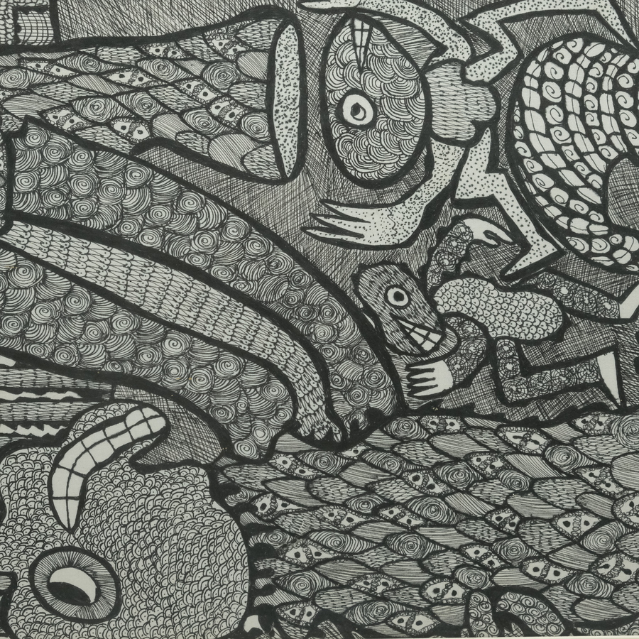 Een tekening inkt op papier. Moderne voorstelling met diverse figuren en dieren. Niet gesigneerd maar van Z.K. Oloruntoba (Nigeria 1934- Nigeria 2014). Gelijst.