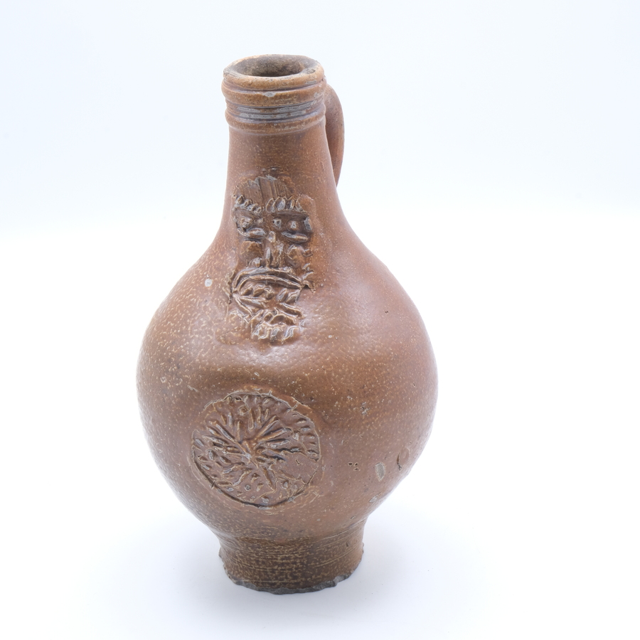 Een 18e eeuwse Engels zwart aardewerken theepot op drie voetjes zgn Jackware. Deksel bekroond met een duif en met resten van de koud beschilderde florale decors. Ca 1760.