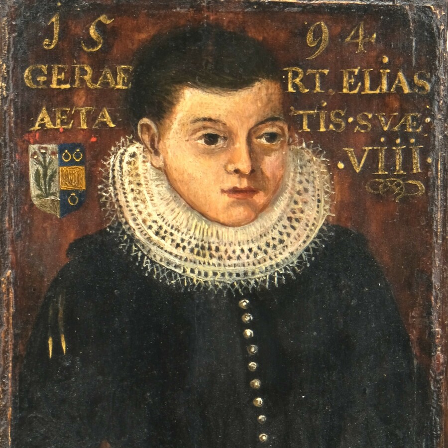 Schilderij, olieverf op paneel. Portret van Geraert Elias, borstlengte, met witte kanten kraag. Met familiewapen van Elias en tekst ' 1594 GERAERT ELIAS AE...