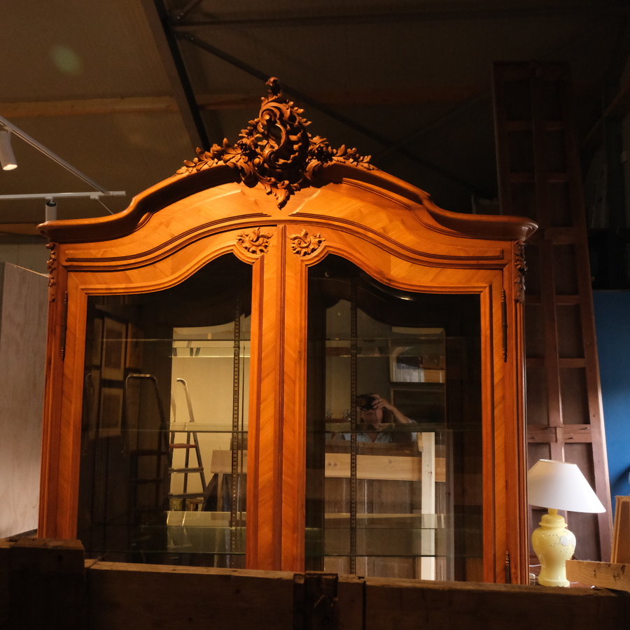Een antieke 19e eeuwse Franse notenhouten vitrinekast met gestoken kuif, spiegel achterwand en vijf glazen leggers