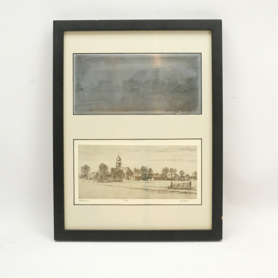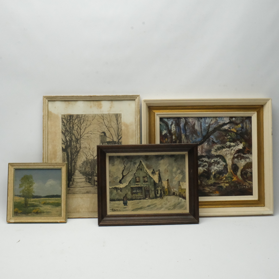 Een lot van drie schilderijen, olieverf op panelen. Voorstellingen van stadsgezicht, landschap en canterellen in het bos. Hierbij een ets, Februari zon te Schierrmonnikoog uit 1926 van Johan Hem...