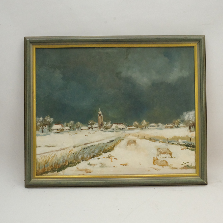 Schilderij, olieverf op doek, in vergulde ornamentenlijst. Hollands polderlandschap. Rechtsonder gesigneerd Johannes (Jan) van Lingen (1903 - 1986).