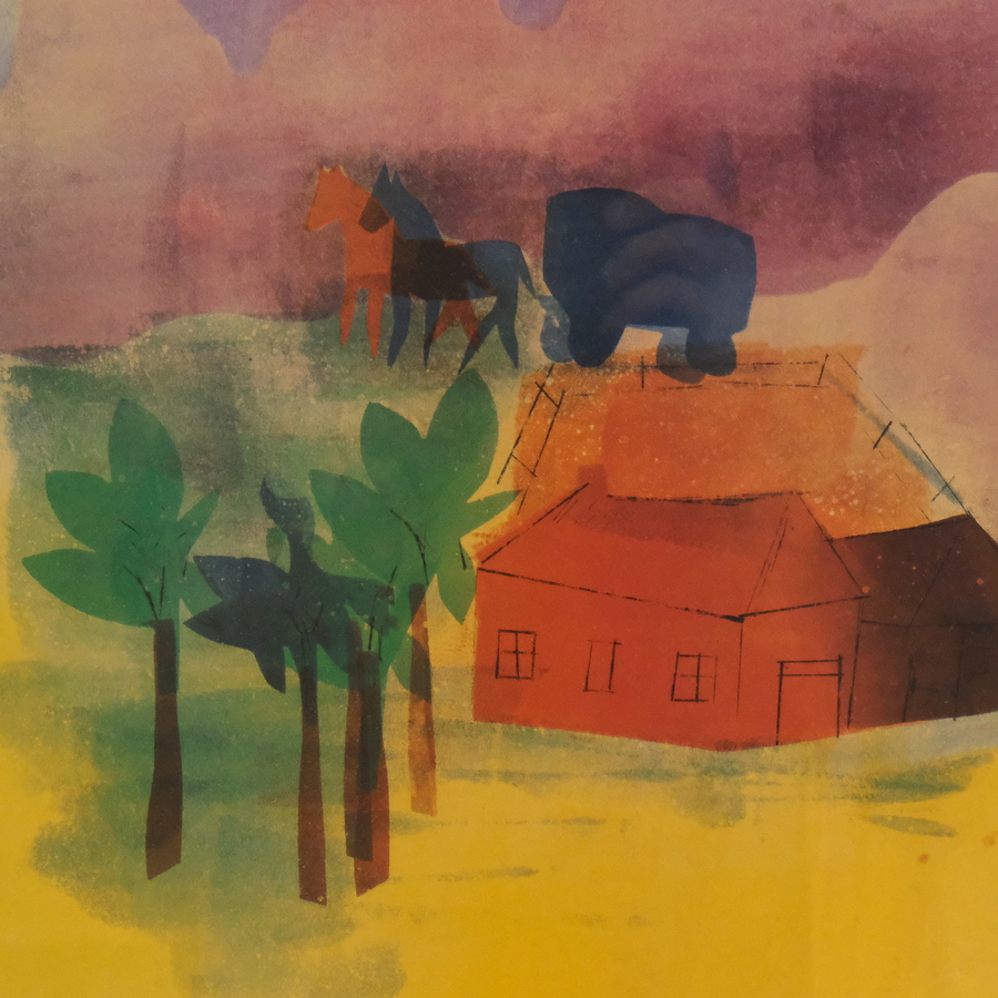Litho, 48,5 x 31 cm. De herberg in de Karphaten. In de druk gesigneerd Hendrik Nicolaas Werkman (Leens 1882 – Bakkeveen 1945)