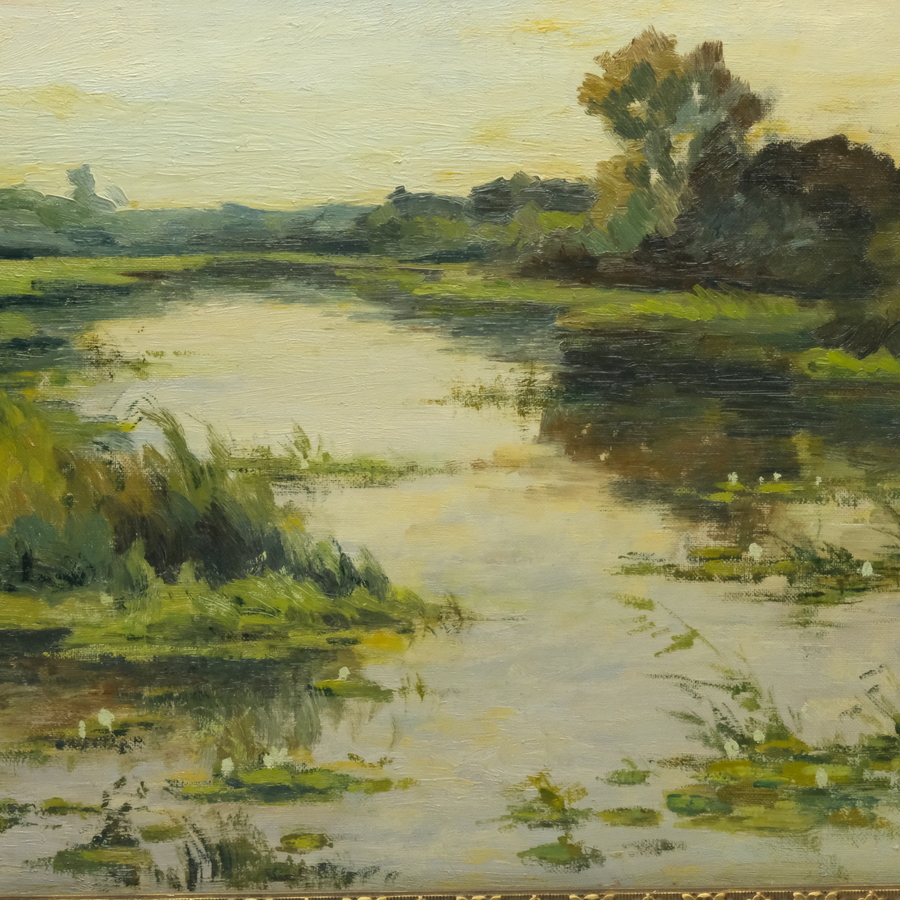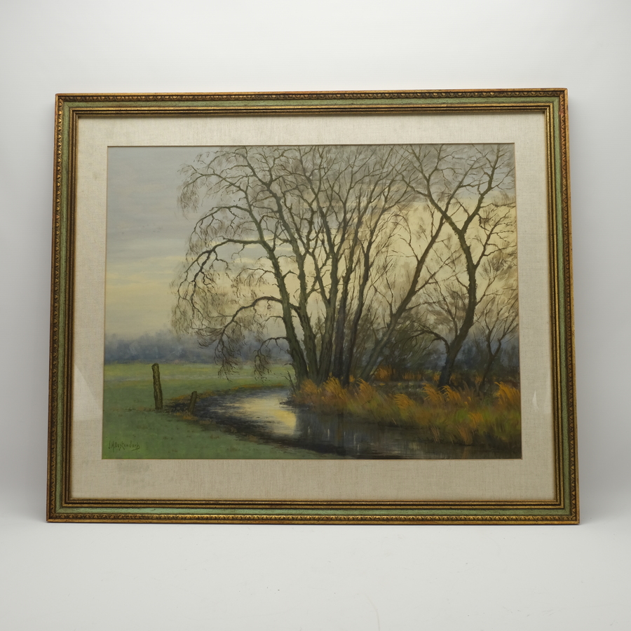 Pastel op papier. Gezicht op de Drentsche Aa. Linksonder gesigneerd Jan Harm Oostendorp (Den Helder 1896 - Assen 1979)