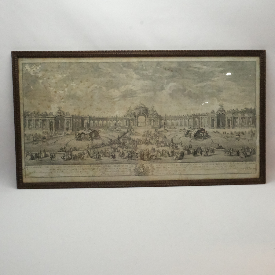 Een 18e eeuwse kopergravure in lijst met voorstelling van het paleis van Versailles, getiteld 'Vue Perspective de la Décoration Elevéé sur la terrasse du chateau de Versailles'. Gesigneerd Charl...