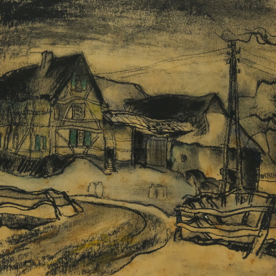 Een houtskooltekening gemengde techniek. Voorstelling een boerenhoeve met paarden. Gesigneerd Fons Volders 1947 (Meerrsen 1894- Sittard 1974). Gelijst.