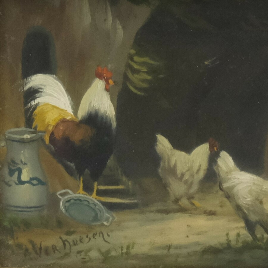 Schilderij, olieverf op paneel. Voorstelling van vier kippen. Kopie naar A. Verhoesen.
