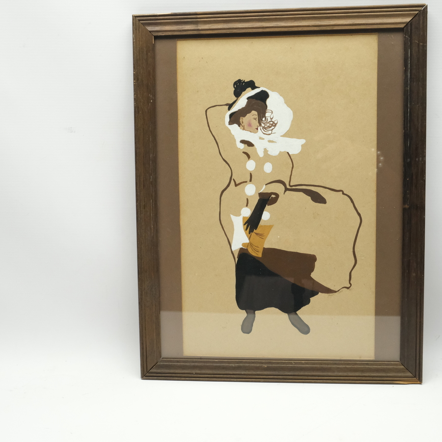 Aquarel. Voorstelling van een dame, art deco stijl. Rechtsonder gesigneerd Jayne Cook en gedateerd 1980.