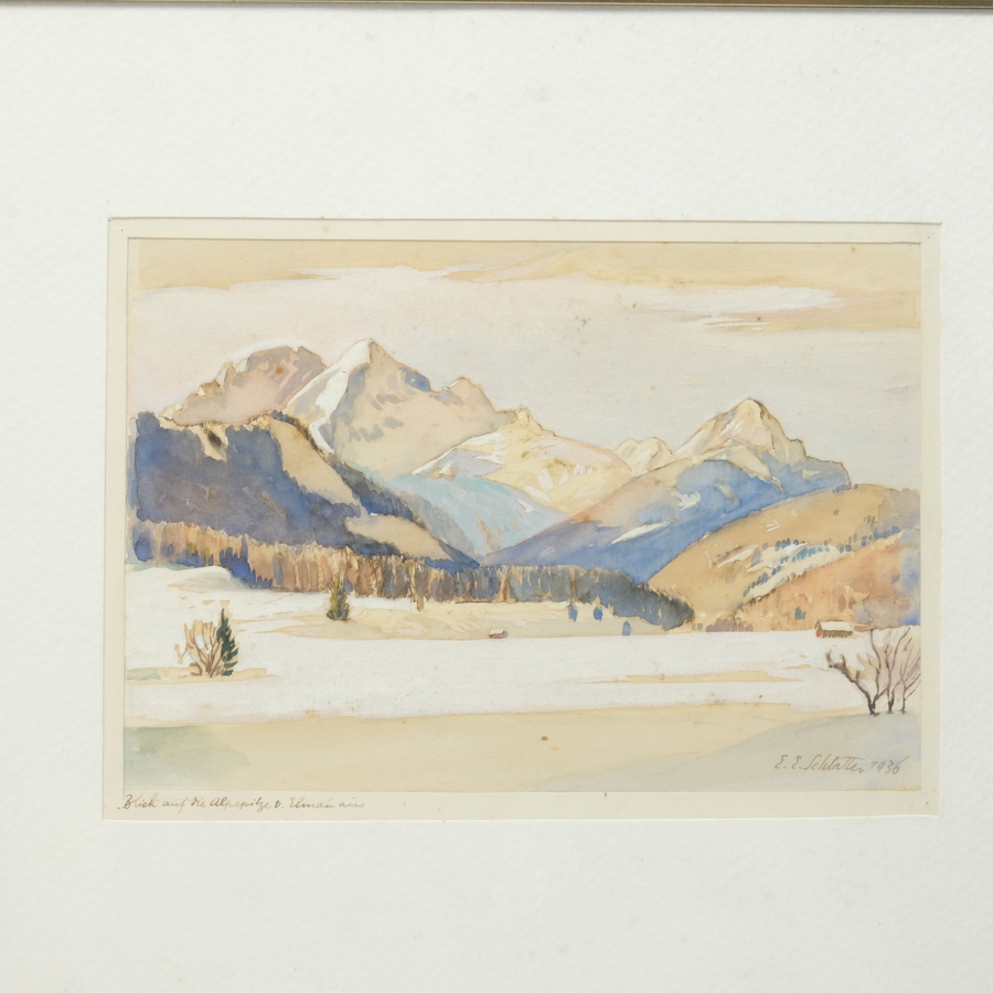 Aquarel. Berlandschap, ‘blick auf die Alpenspitze’. Rechtsonder gesigneerd Ernst Emil Schlatter (Zurich 1883 - Uttwil 1954) en gedateerd 1936.