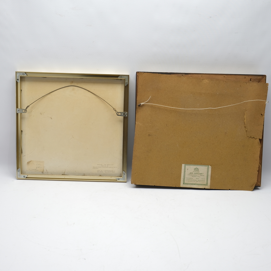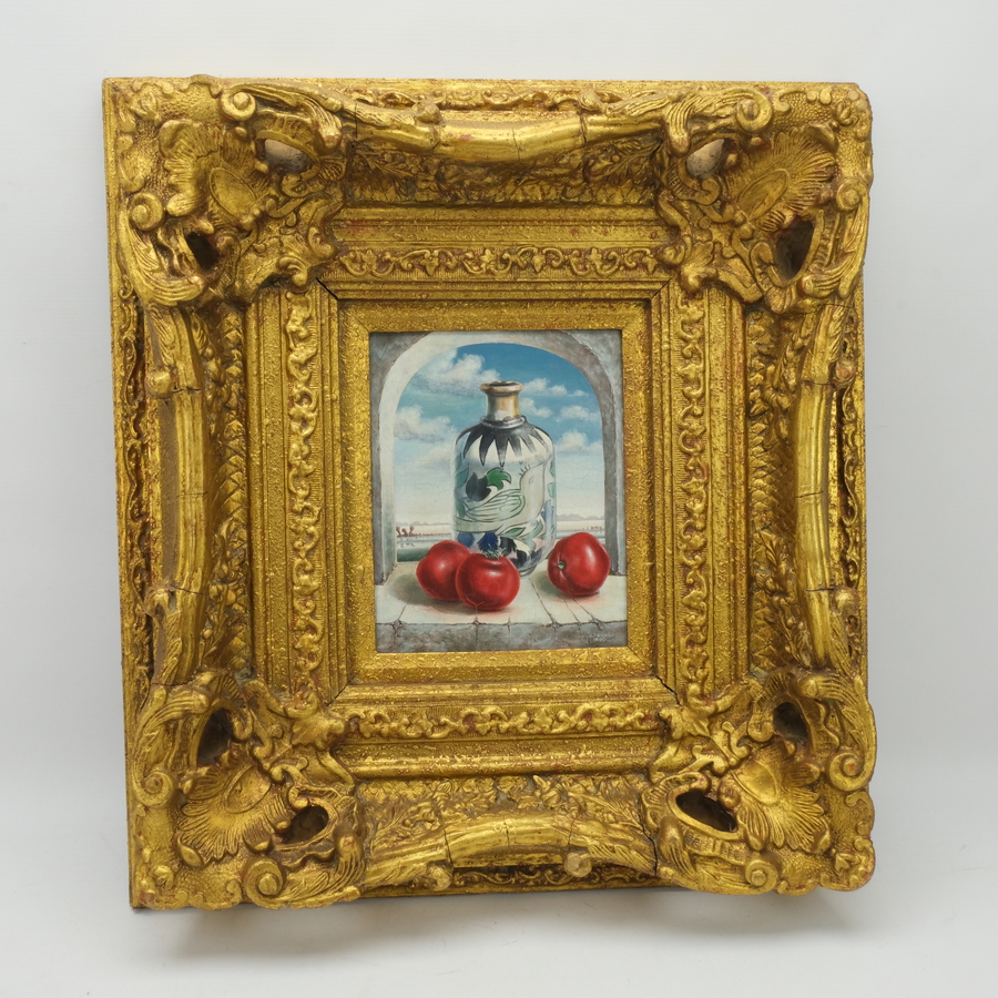 Schilderij, olieverf op paneel, in grote vergulde lijst. Stilleven met tomaten en Perzisch vaasje in een venster. Rechtsonder gesigneerd S. Brands, gedateerd 1990
