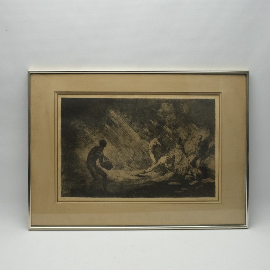 Een ets op papier. 1/30 afdrukken. Mythologische voorstelling van figuren in een grot met stralen zonlicht. Onduidelijk gesigneerd en gedateerd 1909.