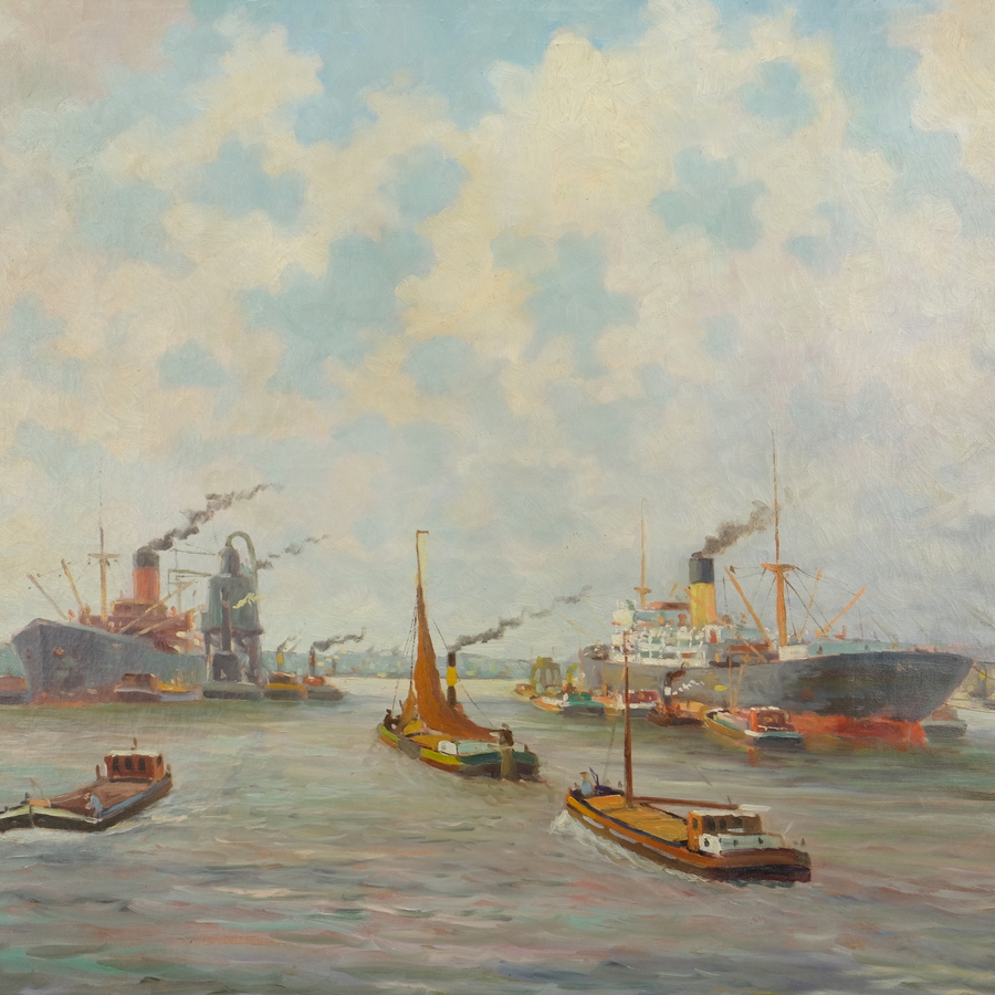 Schilderij, olieverf op doek. Schepen in de haven. Rechtsonder gesigneerd Rorgans, gedateerd 1941.