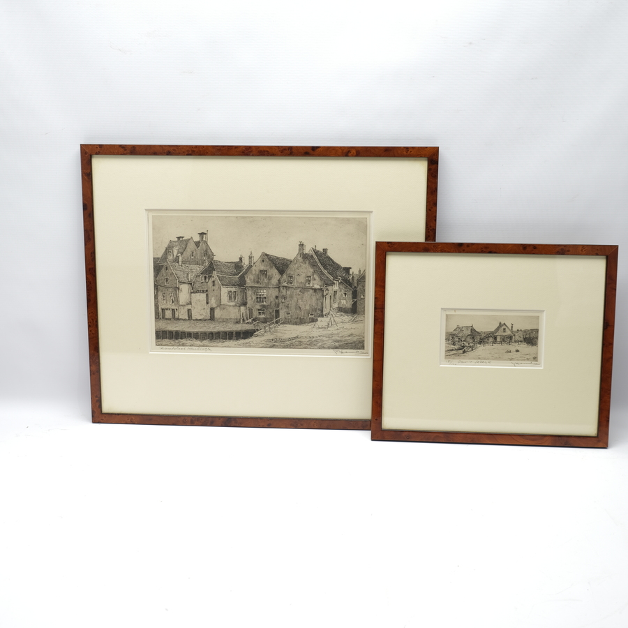 Lot van twee etsen: één getiteld 'Oan é Sedyk', nummer 15/100, rechtsonder gesigneerd Johan Hemkes (Schalsum 1894 - Bilthoven 1988) en gedateerd 1978. De ander getiteld 'Zoutsloot Harlingen', te...