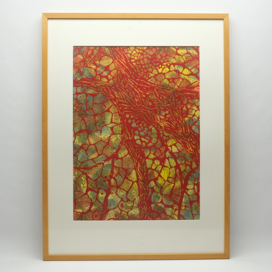 Gemengde techniek. Abstracte voorstelling, titel ‘Body Landscapes 10’. Linksonder gesigneerd Yolande Achterberg, gedateerd 2003.