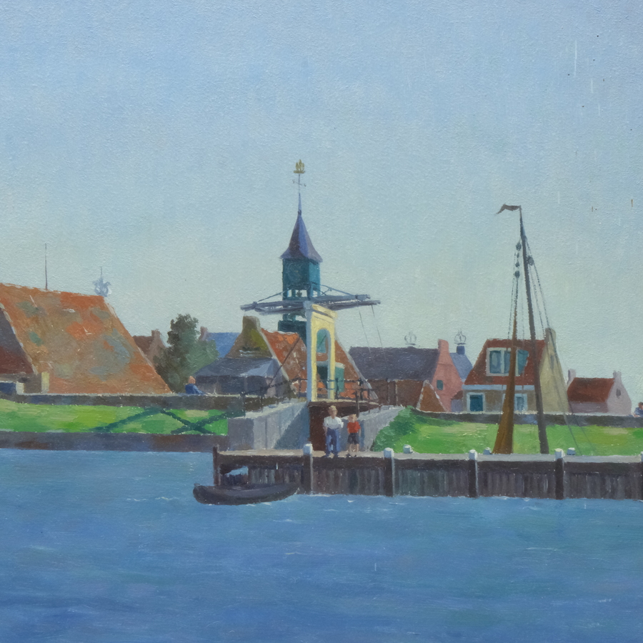 Schilderij, olieverf op board/papier. Gezicht op Hindeloopen vanaf het water. Rechtsonder gesigneerd Frans Hartman (Den Haag 1908-1975), gedateerd 1953