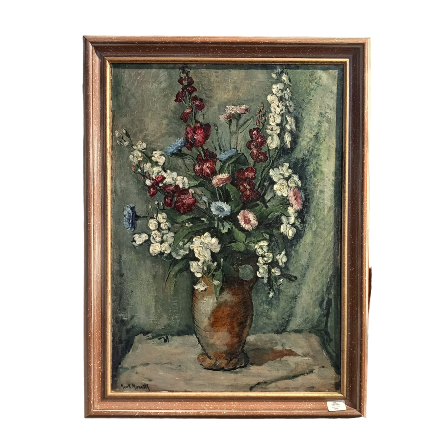Schilderij, olieverf op doek. Bloemstilleven in een Middeleeuws steengoed kruikje. Linksonder gesigneerd (Andries) Henk Munnik (Middelburg 1912 – Den Haag 1997).