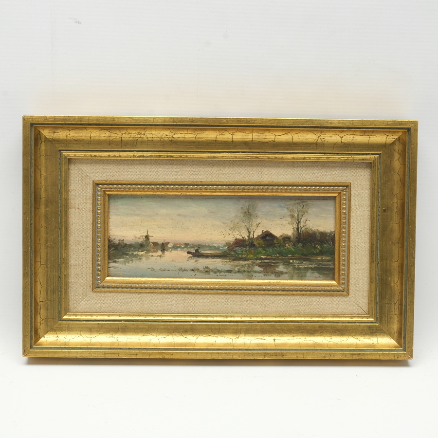 Schilderij, olieverf op paneel 8 x 21,5 cm, in vergulde profiellijst. Visser op het water. Op de achterzijde gesigneerd Frits Goosen (Hilversum, 1943)