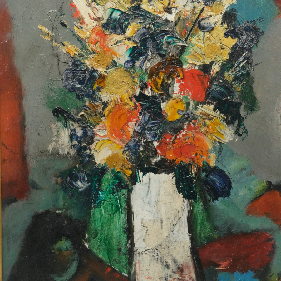 Schilderij, olieverf op board. Abstract bloemstilleven. Rechtsonder gesigneerd ‘Pape’, gedateerd 1984.