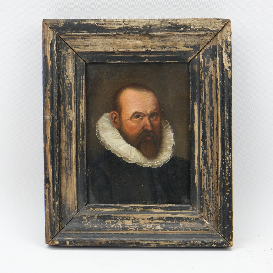 Schilderij, olieverf op koper, in houten lijstje. Portret van een man met kanten kraag. Naar 16e of 17e eeuws voorbeeld.