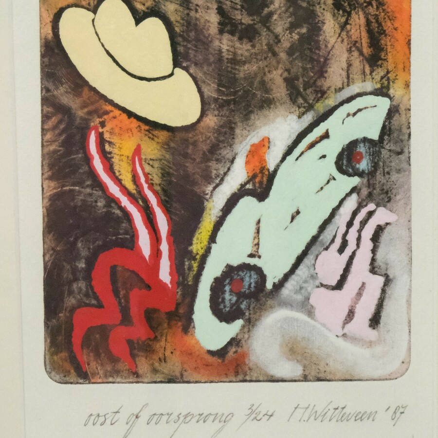 Zeefdruk, 16 x 19 cm.”Oost of orsprong”, oplage 3/24. Rechtsonder gesigneerd Holly Witteveen (Leeuwarden, 1948), gedateerd 1987. Herkomst, galerie Eewal, Leeuwarden