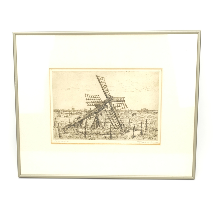 Twee etsen. Eén ets met voorstelling van een molen in landschap, getiteld 'Tjasker'. Rechtsonder gesigneerd Johan Hemkes (Schalsum 1894-Bilthoven 1988), gedateerd (in de druk) 1969. Met daarbij ...