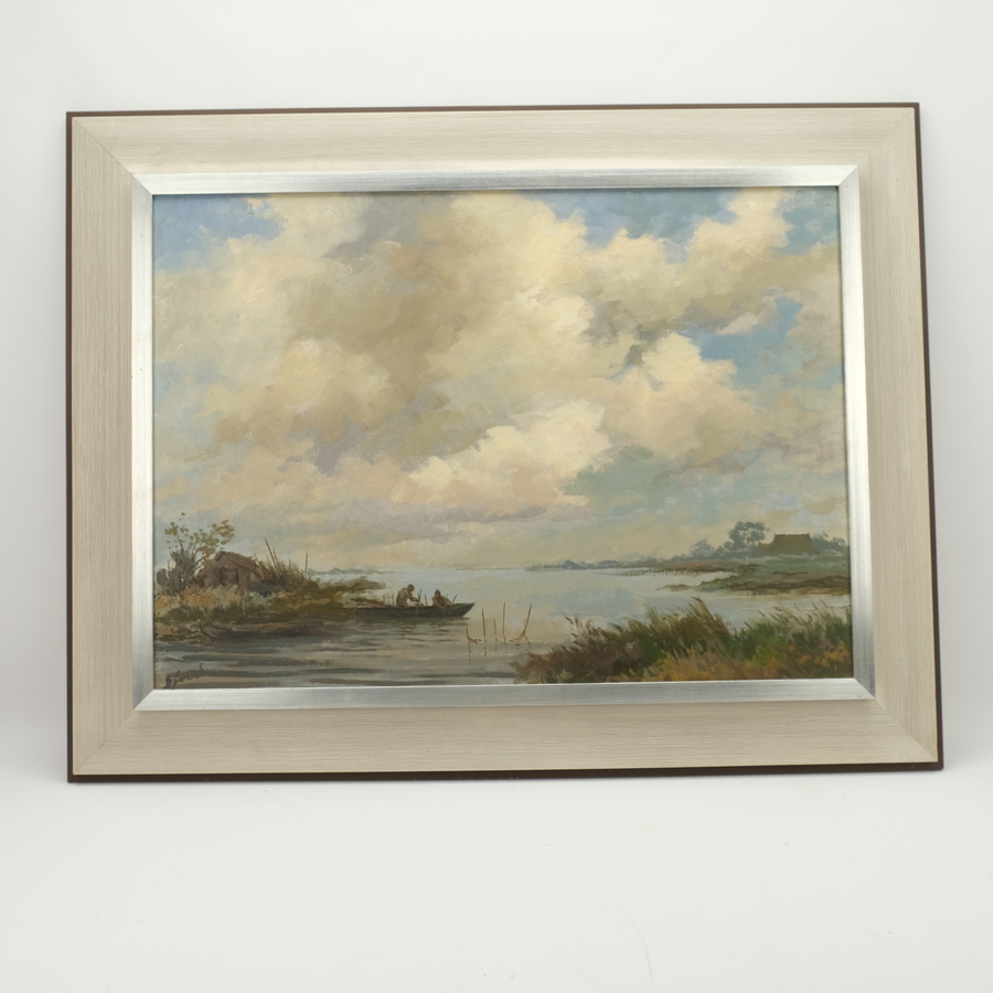 Schilderij, olieverf op doek. Titel 'Fukefiskers op é mar' (fuikenvissers op het meer). Linksonder gesigneerd Sjoerd de Vries (Franeker 1909 – Alkmaar 1996), op de achterzijde gedateerd 1976.
