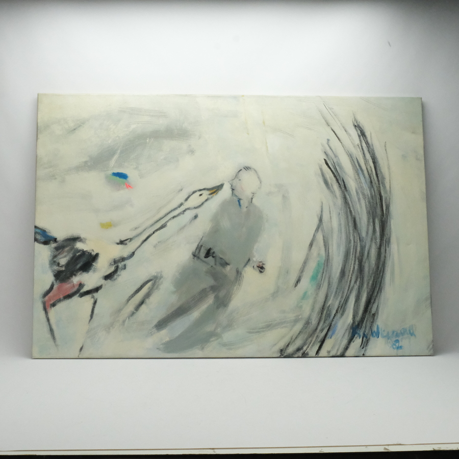 Schilderij, olieverf op doek. Abstracte voorstelling met man en dier. Rechtsonder gesigneerd Rix Wieringa en gedateerd 1982