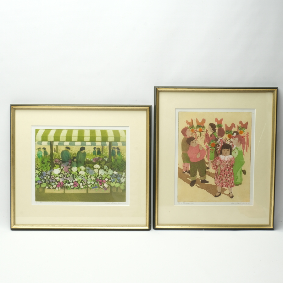 Lot van twee zeefdrukken. Titels ‘Palmpasen’ en ‘de bloemenmarkt’. Beide gesigneerd Willy Belinfante (Rotterdam 1922 – Amsterdam 2014), gedateerd 1990 en 1992. Oplage 6/65 en 9/70.