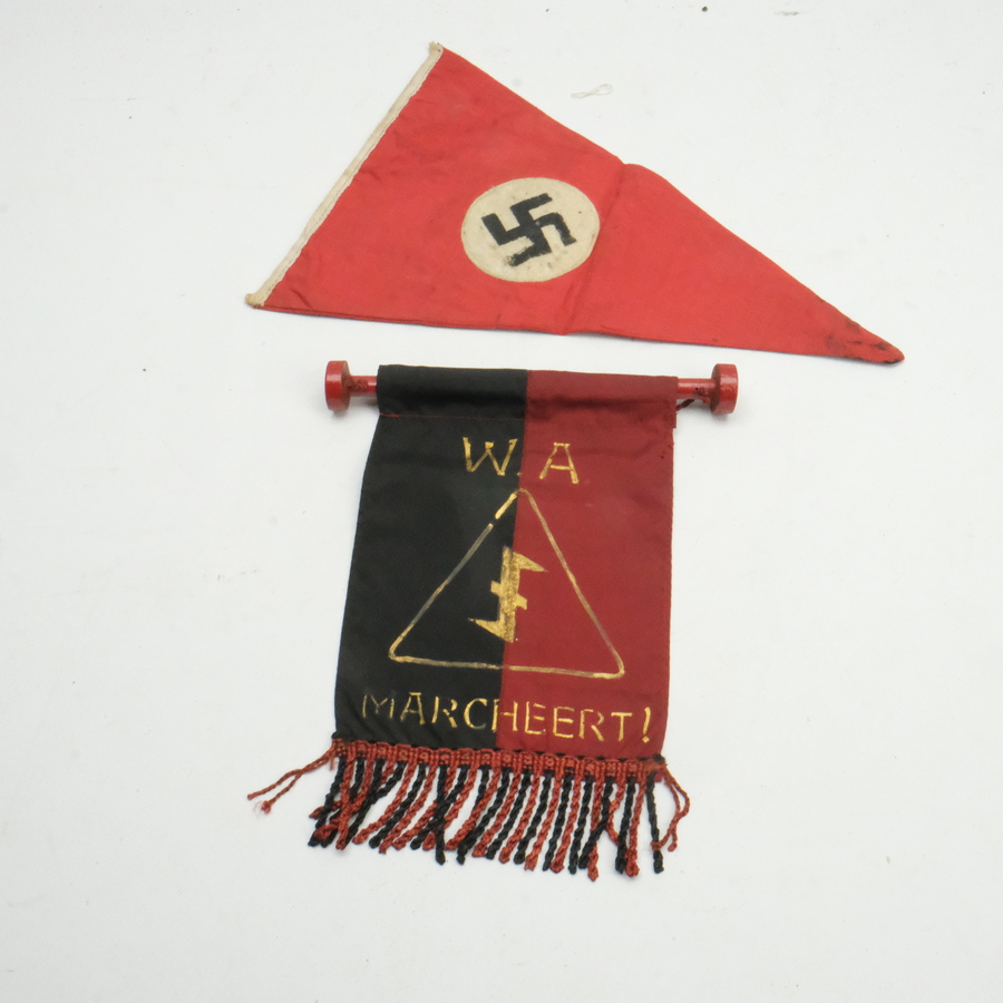 Een jaren '30 of '40 driehoekige vlag met swastika, met daarbij een rood-zwart vaandel met tekst 'WA marcheert!'