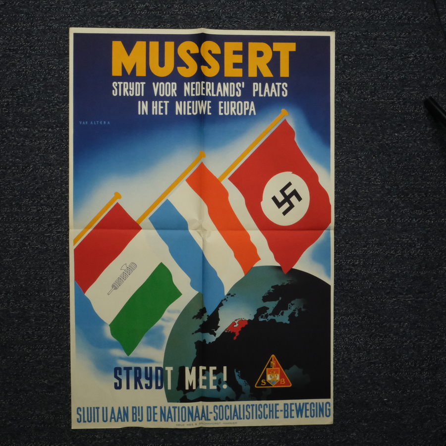 Affiche, 'Mussert Strijdt voor Nederlands' plaats in het nieuwe Europa', 'strijdt mee!', 'sluit u aan bij de nationaal-socialistische-beweging'. Druk Mes & Bronkhorst, Haarlem. Gesigneerd (i...