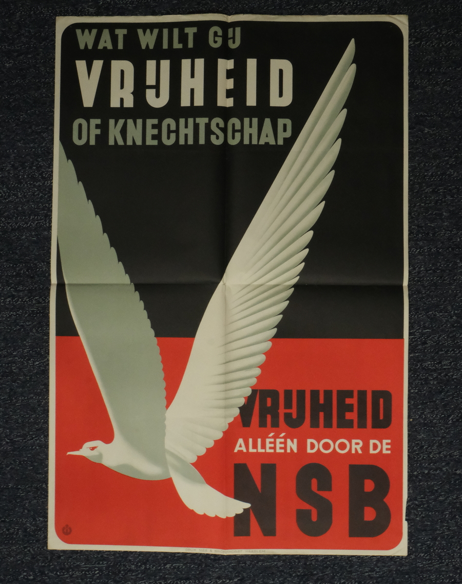 Affiche, 'wat wilt gij vrijheid of knechtschap', 'vrijheid alléén door de NSB'. Druk Mes & Bronkhorst, Haarlem. 1941.