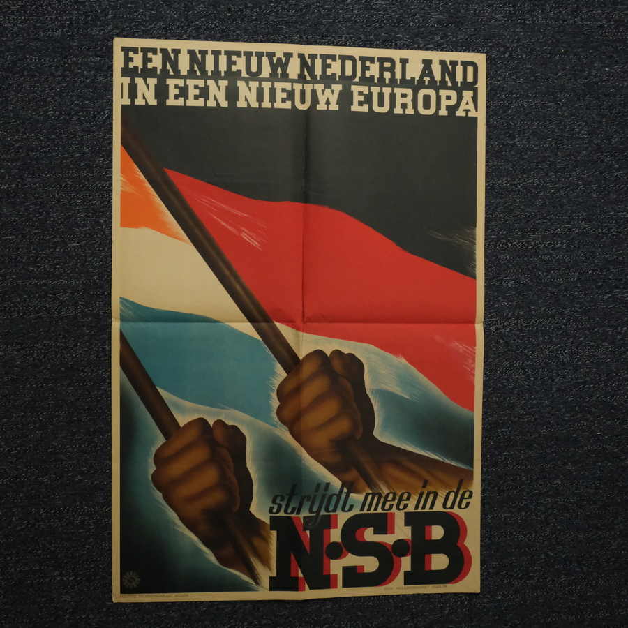 Affiche, 'een nieuw Nederland in een nieuw Europa', 'strijd mee in de N.S.B'. Druk Mes & Bronkhorst Haarlem, 1942