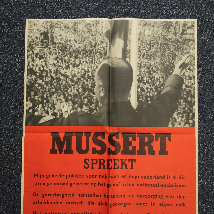 Affiche 'Mussert spreekt', 'strijdt daarom mee in de N.S.B. Met onderschrift 'politieke propagandaplaat no. 5000'