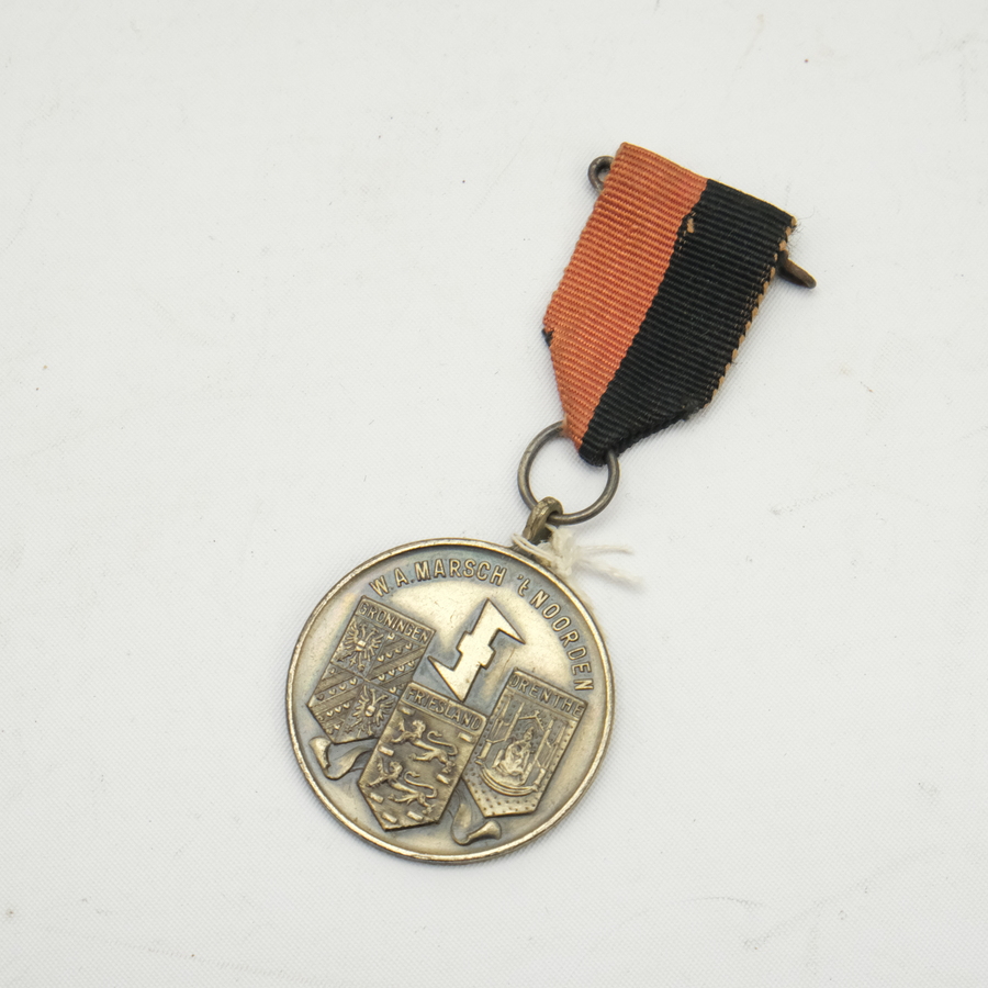 Medaille met opschrift 'W.A. Marsch 't Noorden' met provinciewapens van Groningen, Friesland en Drenthe. Op de achterzijde gedateer 1942. Aan rood-zwart lint met speldje