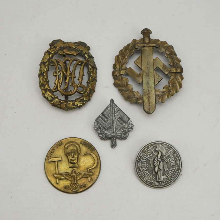 Lot diverse Duitse insignes: een Rijksinsigne voor Sport (DRL), gemerkt 'H. Wernstein Jena-Loestedt D.R.G.M. 35269', een SA sportinsigne, gemerkt Fechler Bernsbach' & 'Eigentum S.A. Sportabz...