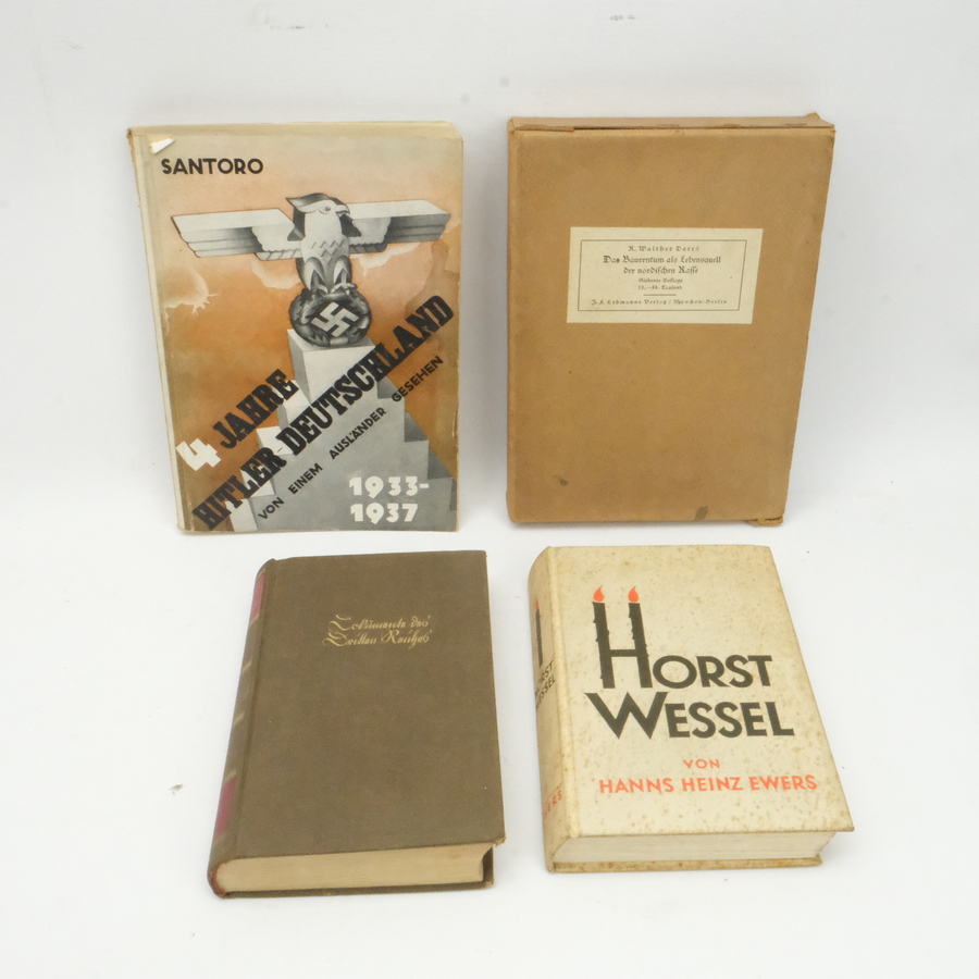 Diverse boeken: '4 Jahre Hitler-Deutschland von einem Ausländer gesehen', C. Santoro, 1937, 'Das Bauerntum als Lebensquell der nordlichen Rasse', Walther Darré, 7. Auflage, 1938, 'Horst Wessel' ...