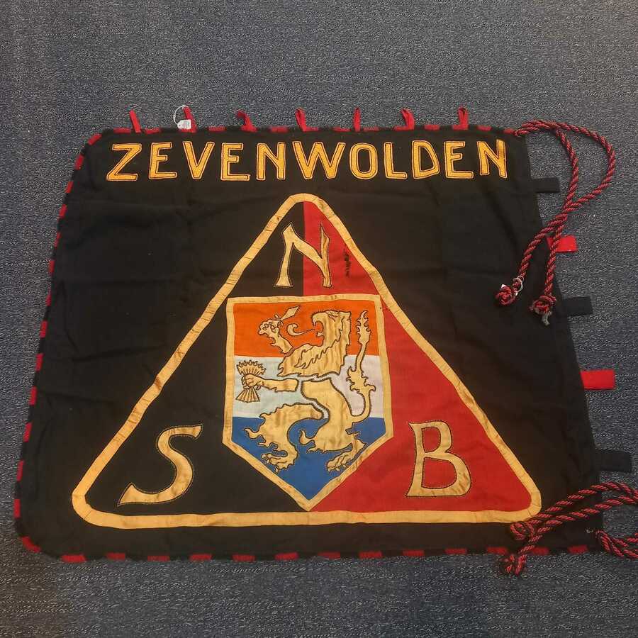 Een jaren '30 geborduurde NSB vlag met opschrift 'Zevenwolden'. 100 x 104 cm