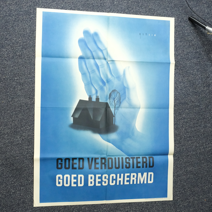 Groot affiche, 'goed verduisterd goed beschermd'. Uitgegeven door Rijksinspectie Luchtbescherming, afdeling pers en propaganda Den Haag. Gesigneerd (in de druk) Johann A.W. von Stein (1896-1965)...