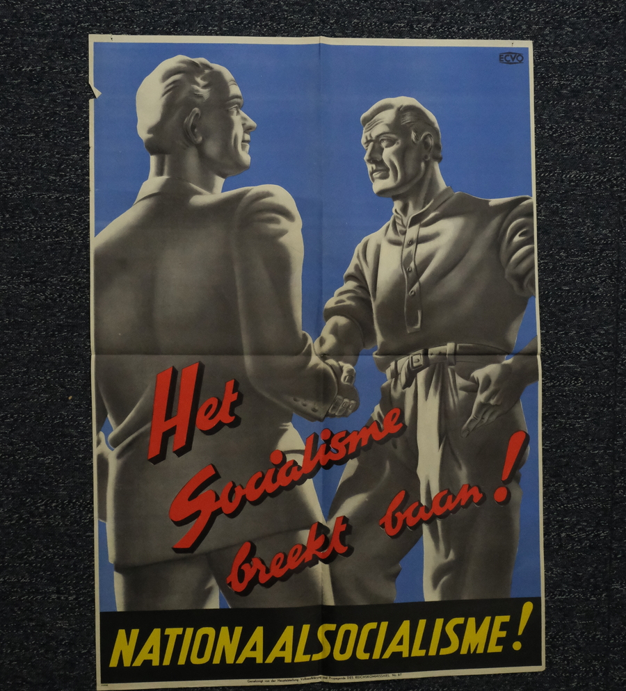 Affiche, 'Het socialisme breekt baan!', 'Nationaalsocialisme!'. Gesigneerd Ervaco, 1942.