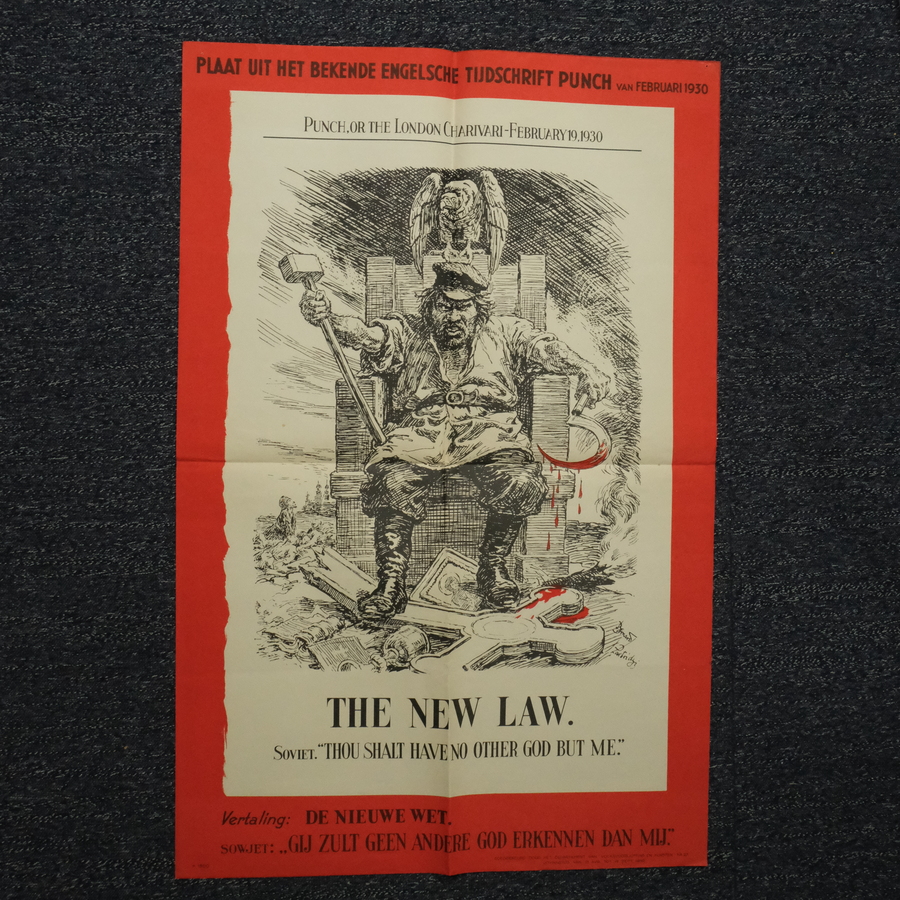 Affiche, spotprent uit het Engelse tijdschrift Punch: 'the new law', thou shalt have no other god but me'. Gesigneerd Partridge, 1942