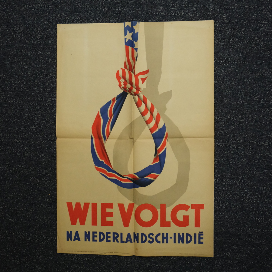 Affiche, 'Wie volgt na Nederlandsch-Indië', met onderschrift 'Genehmigt von hauptabteilung volksaufklärung und propaganda beim reichskommissar N. 5021 van 12 mei tot 1 juni '42', druk Mes & ...